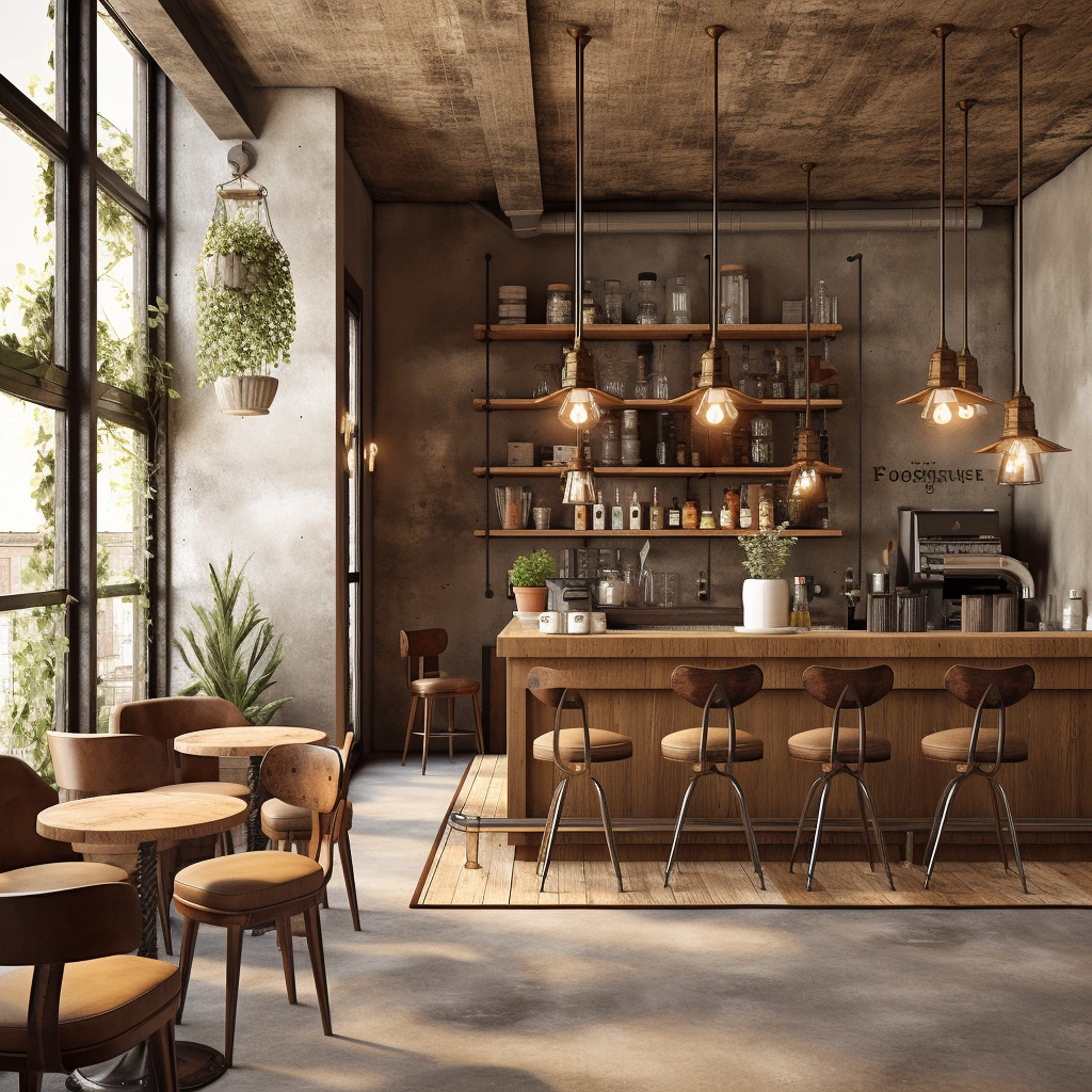 카페 인테리어 2. 러스틱과 빈티지: 러스틱한 매력과 빈티지한 우아함을 결합한 카페 인테리어를 만드십시오. 콘크리트, 나무, 금속의 팔레트를 사용하여 고전적인 향수와 현대적인 세련미 사이의 균형을 이루어냅니다. 노화된 나무 텍스처와 빈티지 장식을 강조하여 시대를 초월한 분위기를 만들어냅니다.
