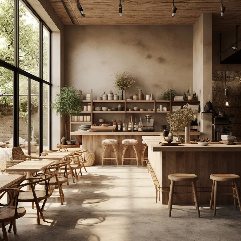 카페 인테리어 9. 토착적이고 친환경적인 카페: 토착적이고 친환경적인 요소에 초점을 맞춘 카페 인테리어를 디자인하십시오. 점토와 같은 현지 소재를 활용하고 지속 가능한 요소를 도입합니다. 심플함과 흙과의 연결을 강조하여 고요한 환경을 만듭니다.