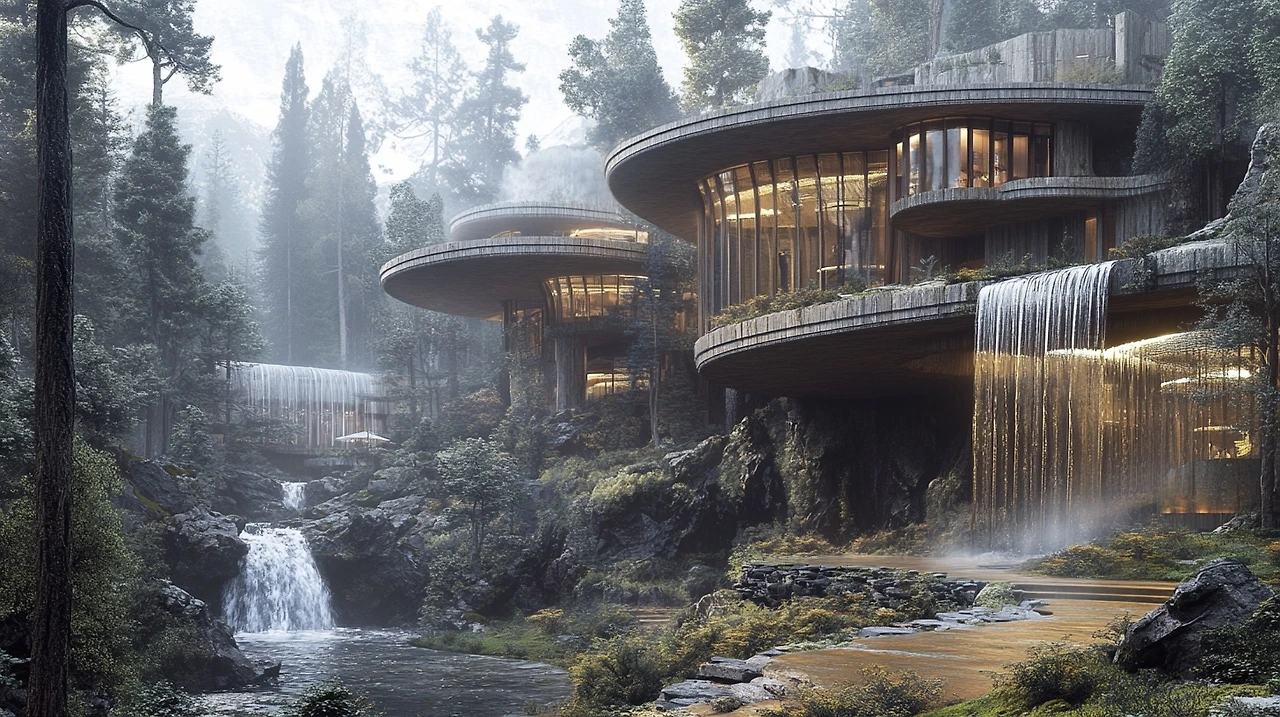 주변 경관에서 출발한 콘셉트가 어떻게 아이코닉한 건축물로 이어지는지를 보여주는 예입니다. 이 주택은 폭포 위에 세워졌는데, 폭포 소리가 집 내부로 자연스럽게 들어오도록 설계되어, 그의 오가닉(Organic) 건축 철학을 잘 드러냅니다.