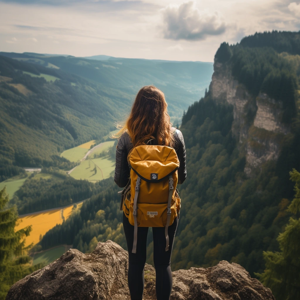: 산행 중인 젊은 여성의 다이나믹한 사진. 그녀는 정상에 서 있으며, 숨 막히는 계곡과 숲의 전경을 내려다보고 있다. 등산 장비와 배낭을 착용한 그녀는 모험과 탐험의 정신을 보여준다.