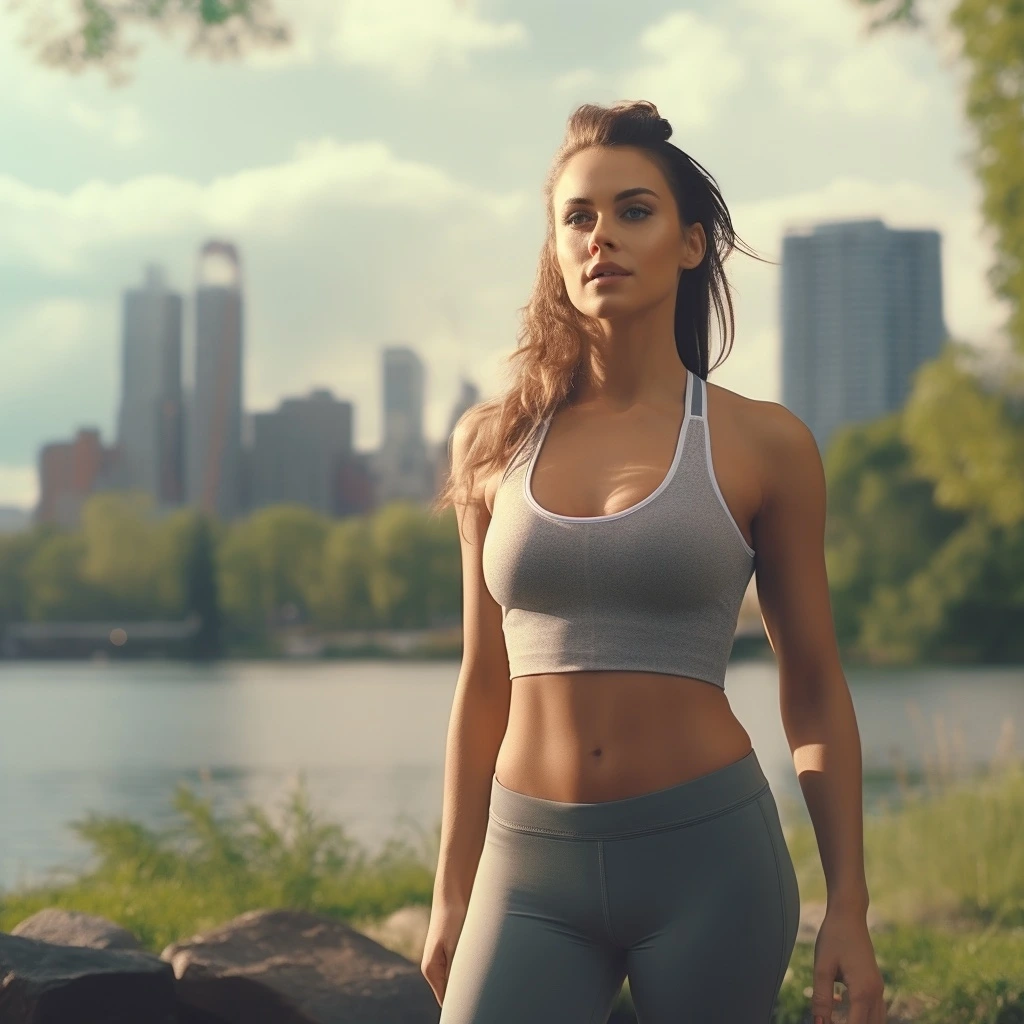 : 경치 좋은 공원이나 도시 환경에서 요가나 운동을하는 스타일리시한 운동복을 입은 젊은 여성의 에너지 넘치는 이미지. 배경에는 녹색 식물과 도시 풍경이 포함되어 있어, 운동과 도시 생활을 혼합한 모습을 보여준다.