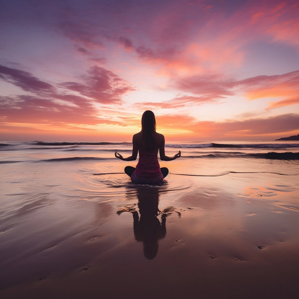 : 석양이 지는 해변에서 요가를 연습하는 젊은 여성의 평온한 이미지. 그녀는 우아한 자세로, 바다의 파도가 조용히 밀려오는 해변에서 요가를 하고 있다. 하늘은 주황색, 분홍색, 자주색으로 물들어 평화롭고 안정감 있는 분위기를 조성하고 있다.