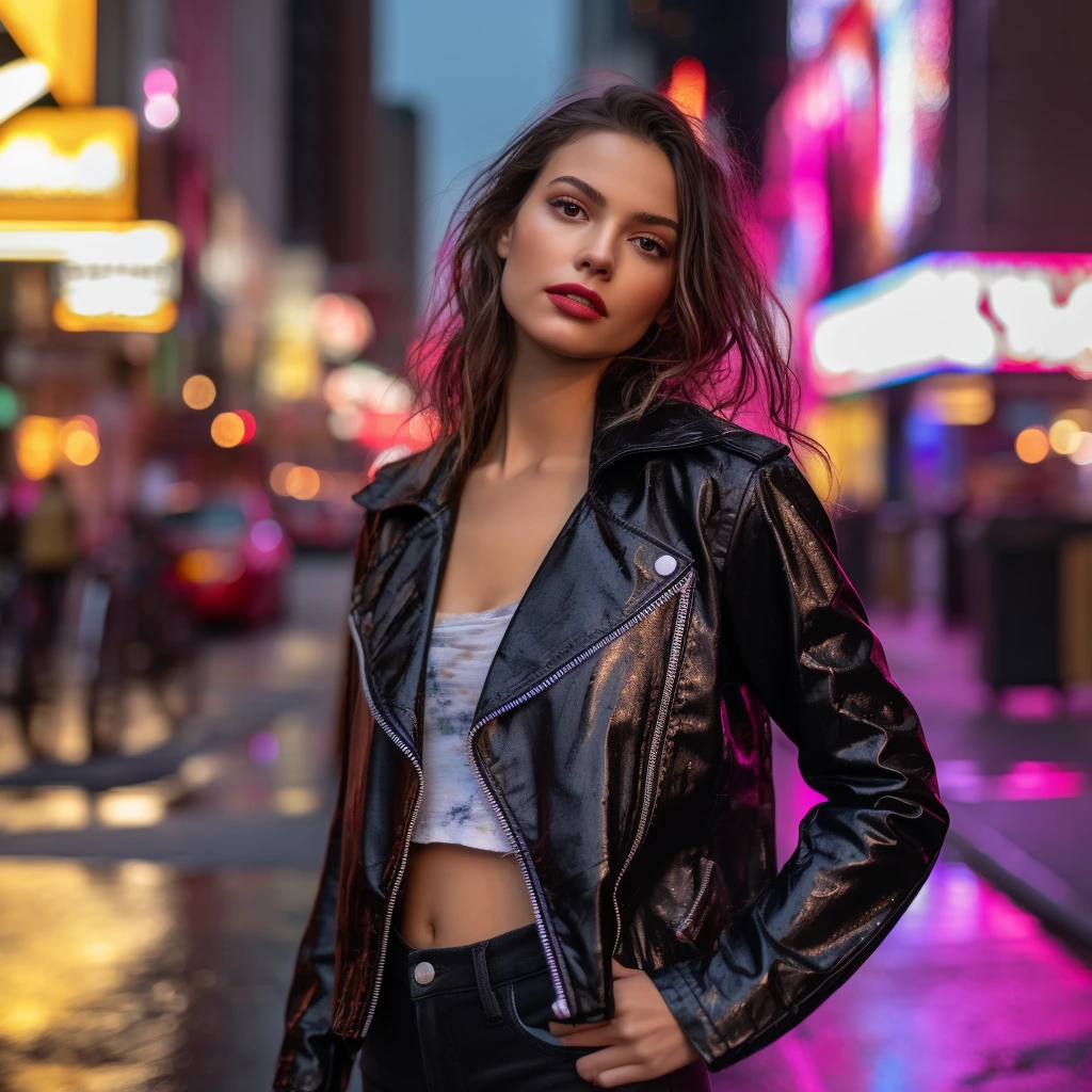 : 트렌디한 도시 패션 감각을 가진 젊은 여성. 북적이는 도시 거리에서 스타일리시한 가죽 자켓, 찢어진 청바지, 대담한 액세서리를 착용하고 있다. 배경은 그래피티 아트와 네온 라이트로 가득하며, 활기찬 도시 분위기를 담고 있다.