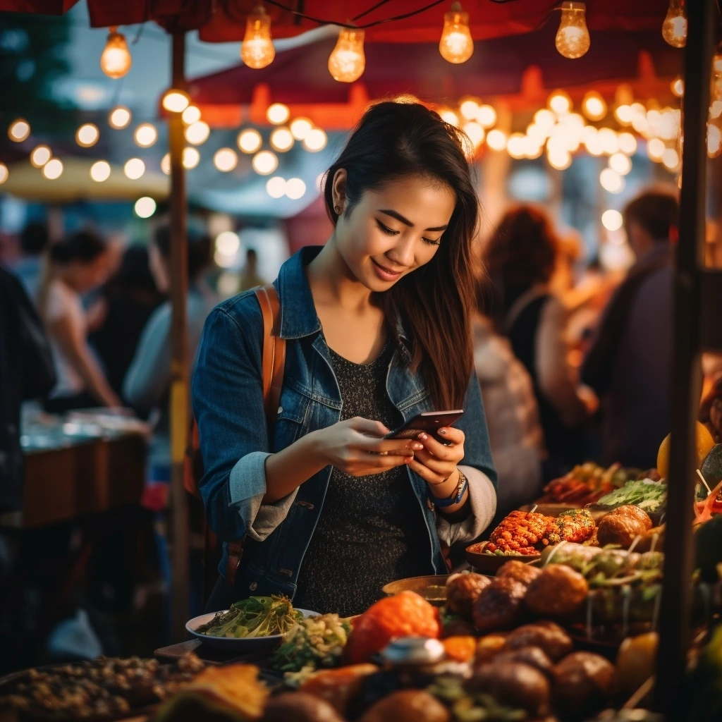 : 다채롭고 활기찬 야외 시장에서 길거리 음식을 즐기는 젊은 여성의 이미지. 그녀는 스마트폰으로 음식을 찍으며, 다양한 음식 부스와 북적이는 사람들 사이에서 도시 음식 문화의 본질을 담아냈다.