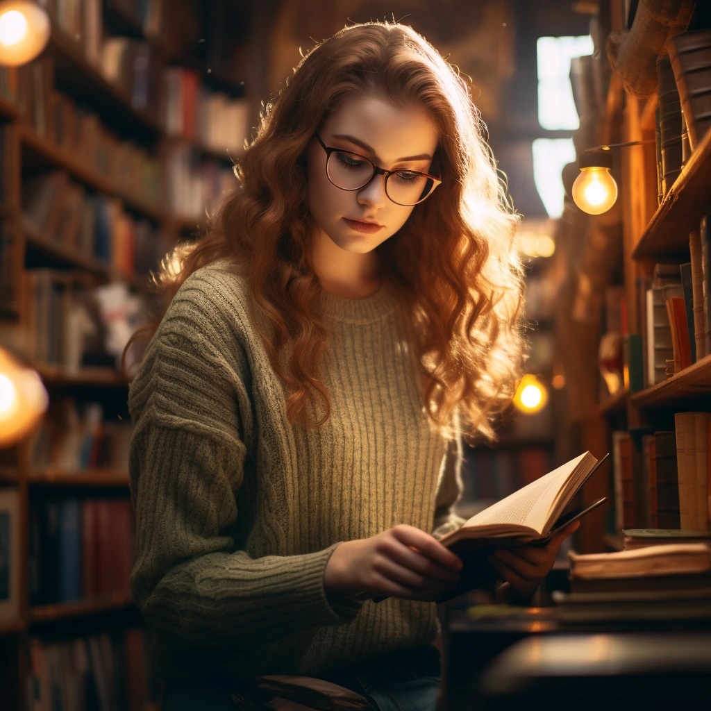 : 아늑하고 고풍스러운 서점에서 젊은 여성의 모습을 담은 이미지. 그녀는 편안한 스웨터와 안경을 착용하고 있으며, 골동품 책들로 가득한 선반들을 둘러보고 있다. 부드러운 조명과 나무 인테리어는 따뜻하고 친근한 분위기를 만들어낸다.