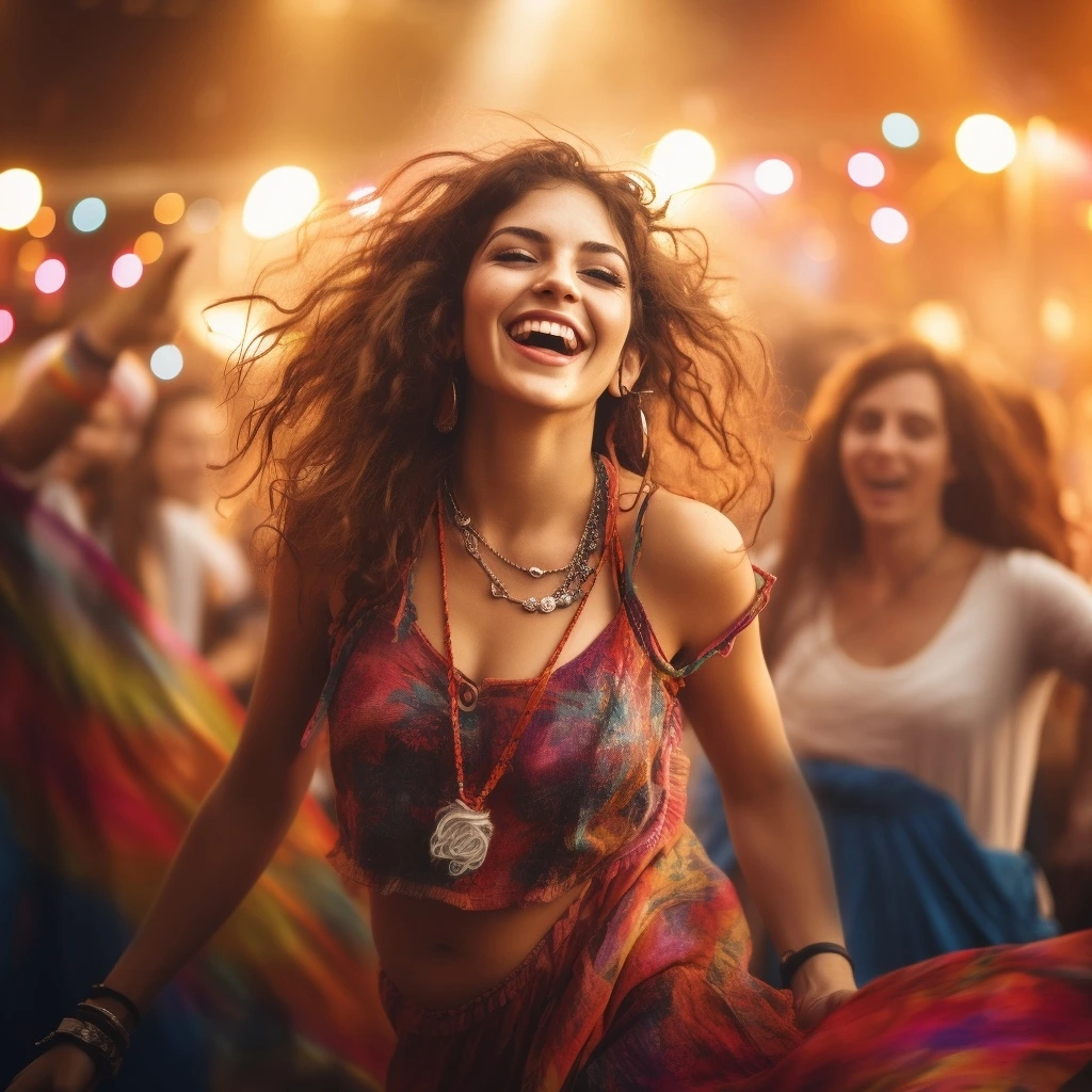 : 음악 축제에서 젊은 여성의 활기찬, 다채로운 사진. 그녀는 보헤미안 스타일의 옷을 입고 친구들과 함께 춤을 추며, 배경에는 축제의 무대와 조명이 보여져, 살아있는 음악의 에너지와 흥분을 담아낸다.
