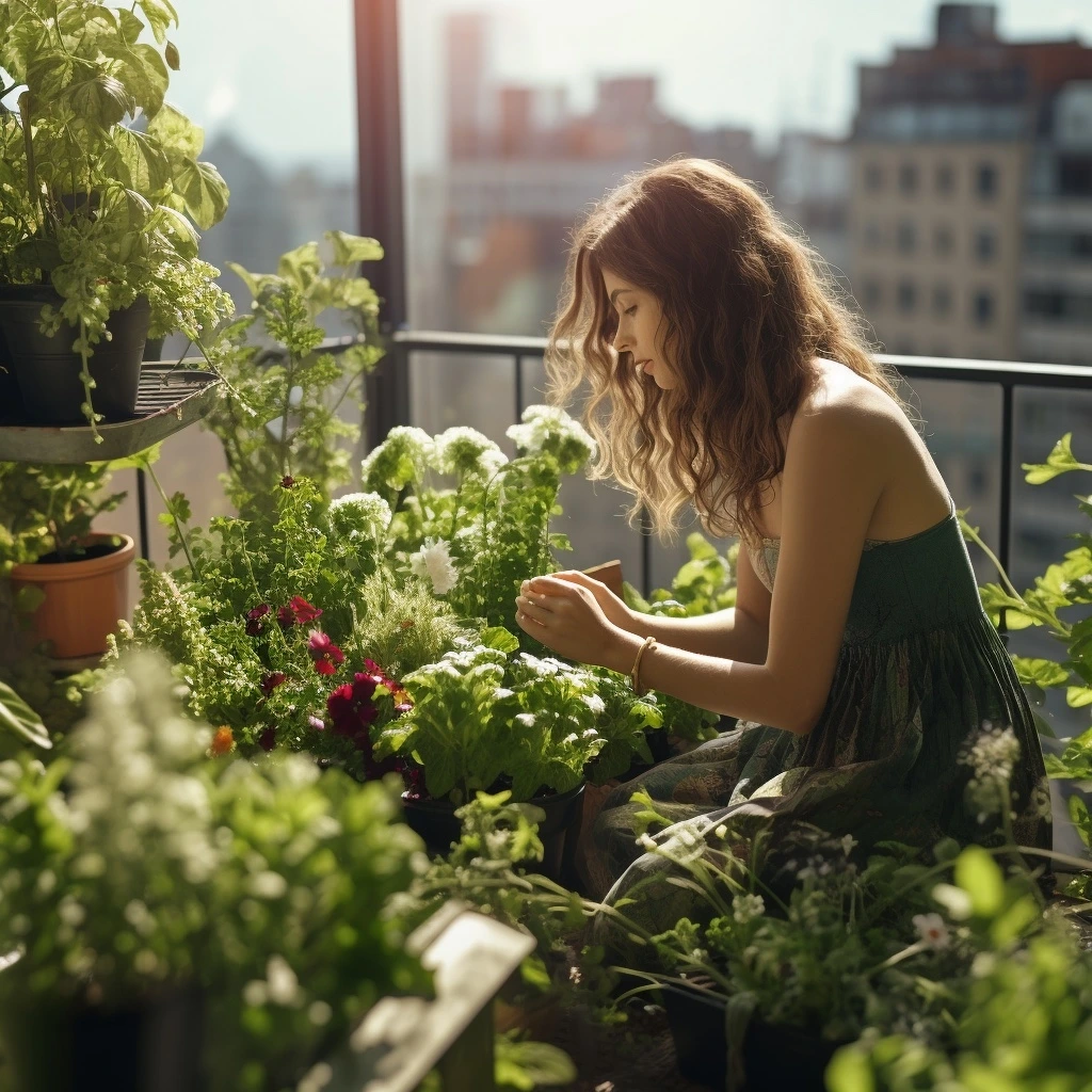 : 도시 환경에서 옥상이나 발코니 정원을 가꾸는 젊은 여성의 이미지. 그녀는 빼곡한 식물과 꽃들로 둘러싸여 있으며, 편안한 원예 복장을 입고 도시 환경에서의 자연과의 연결을 보여준다.