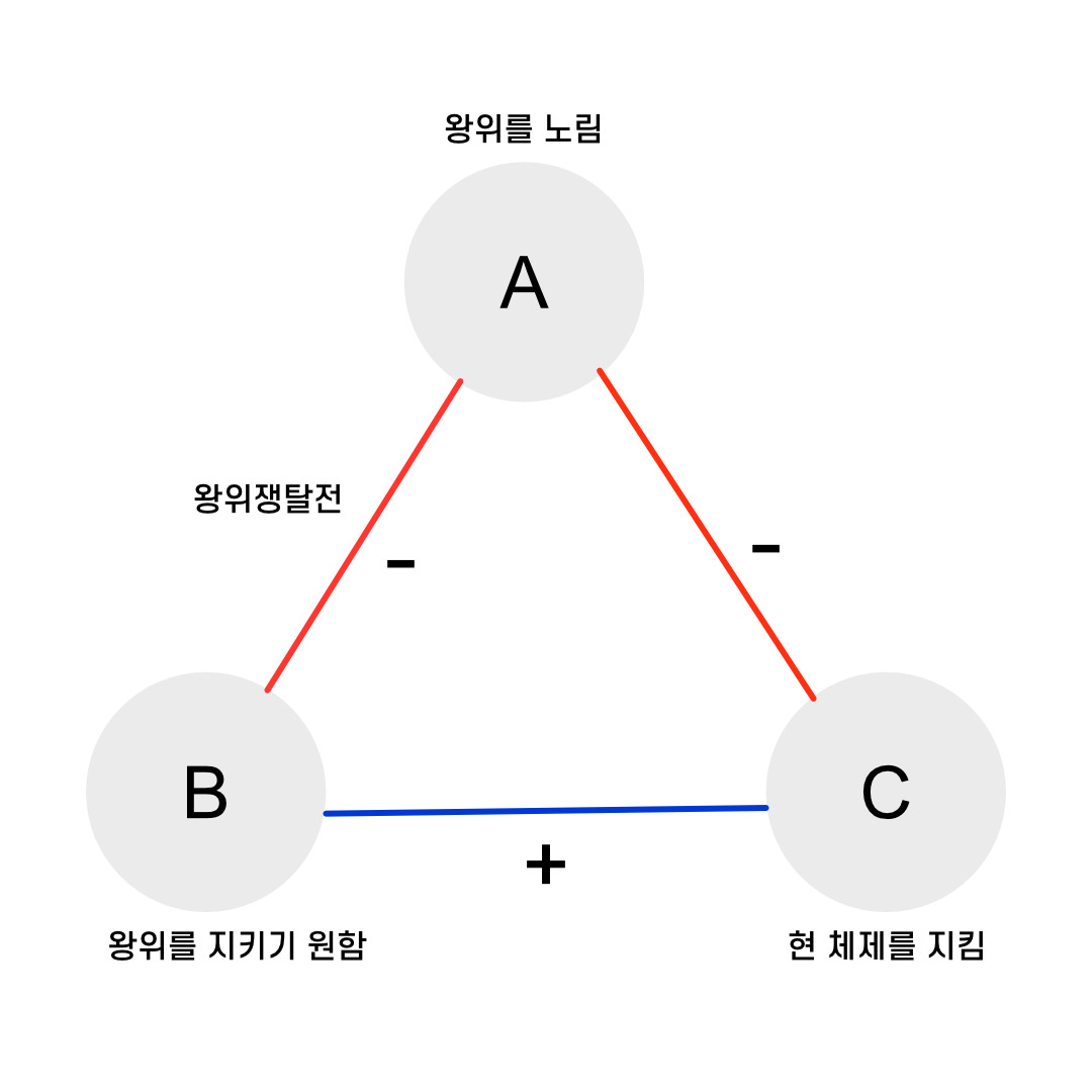 목표나 욕망이 충돌하는 캐릭터 쌍을 찾아 표시합니다. 이제 어떤 인물들의 욕망이 서로 상충하는지 하나씩 짝지어 보세요. 쉽게 말해, 한 캐릭터의 목표 달성이 다른 캐릭터에게 방해가 되는 경우를 찾는 거예요. 위에서 정리한 A, B, C의 예를 계속 써볼까요? A와 B의 경우, 한 사람은 왕위를 노리고 다른 사람은 왕위를 유지하려고 하니 정면 충돌하는 관계가 됩니다. A와 B를 굵은 빨간 선으로 연결하고 “왕위쟁탈전” 같은 메모를 달아둘 수 있겠죠. 다음으로 B와 C를 보면, B는 왕위를 지키고 싶어하고 C 역시 현 체재 유지를 원한다는 공동 목표가 있습니다. 그렇다면 B–C는 동맹이 되므로 파란 선으로 연결합니다. 이런 식으로 각 인물들의 목표가 겹치는지 충돌하는지 관계도에 표시해 보세요. 캐릭터 관계를 정리할 때, 플러스(+)와 마이너스(-) 기호를 활용할 수도 있습니다 둘이 협력하거나 목표가 일치하는 관계면 선 옆에 (+) 표시, 대립하고 갈등하는 관계면 (-) 표시를 해두는 식입니다. 물론 처음부터 너무 복잡하게 표시할 필요는 없고, 메모 정도로만 적어두어도 괜찮습니다. 중요한 것은 “누구와 누구 사이에 갈등이 있는가”를 명확히 짚어내는 것입니다.