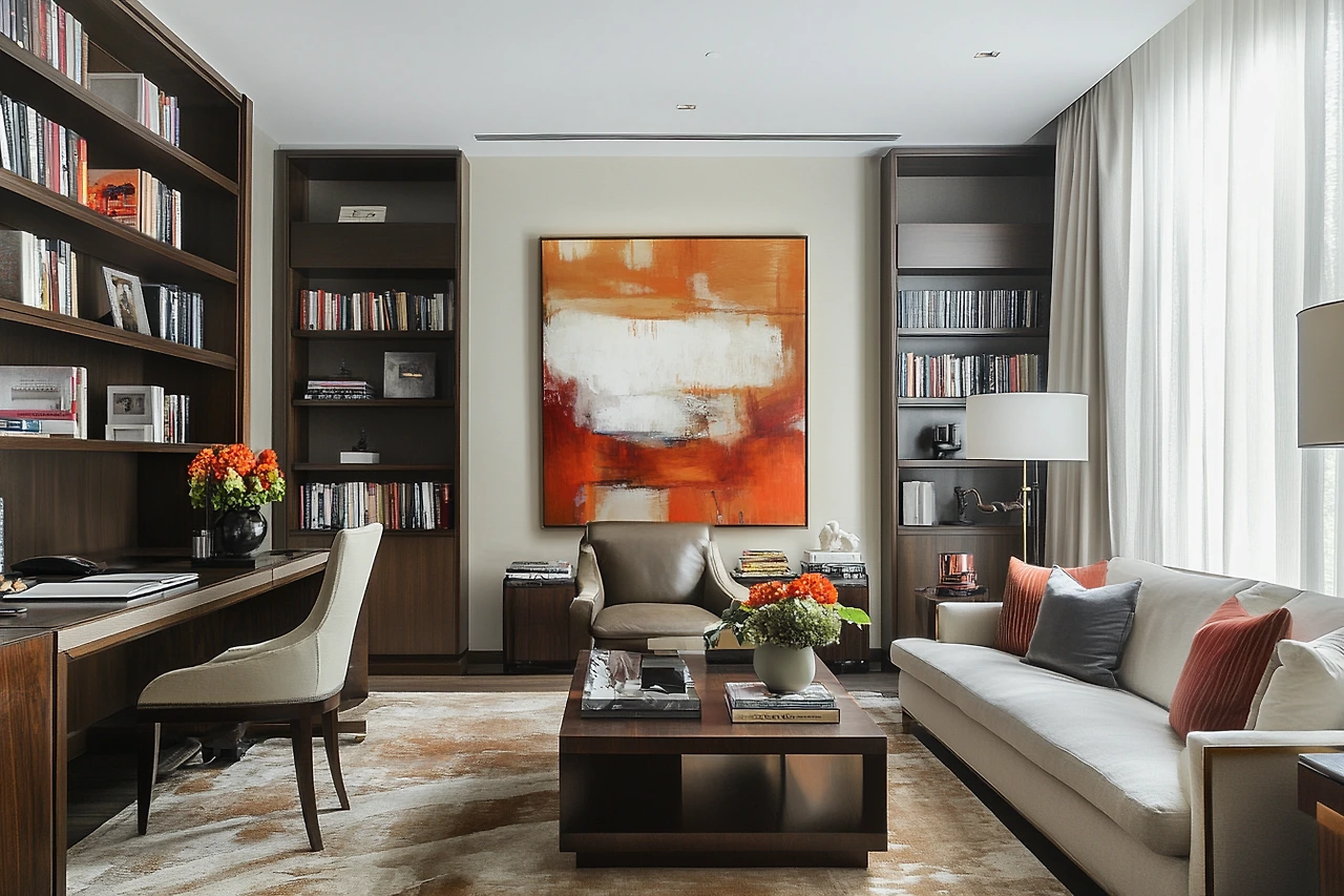 A living room that doubles as a study room, with a functional and stylish desk, bookshelves, and comfortable seating. The space is designed for productivity and relaxation.