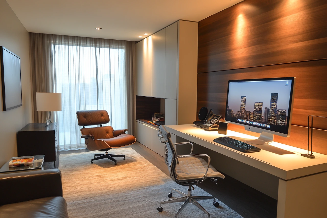A living room with a dedicated computer area, featuring a sleek desk, modern chair, and organized workspace. The computer setup is integrated into the room's decor, offering functionality and style.