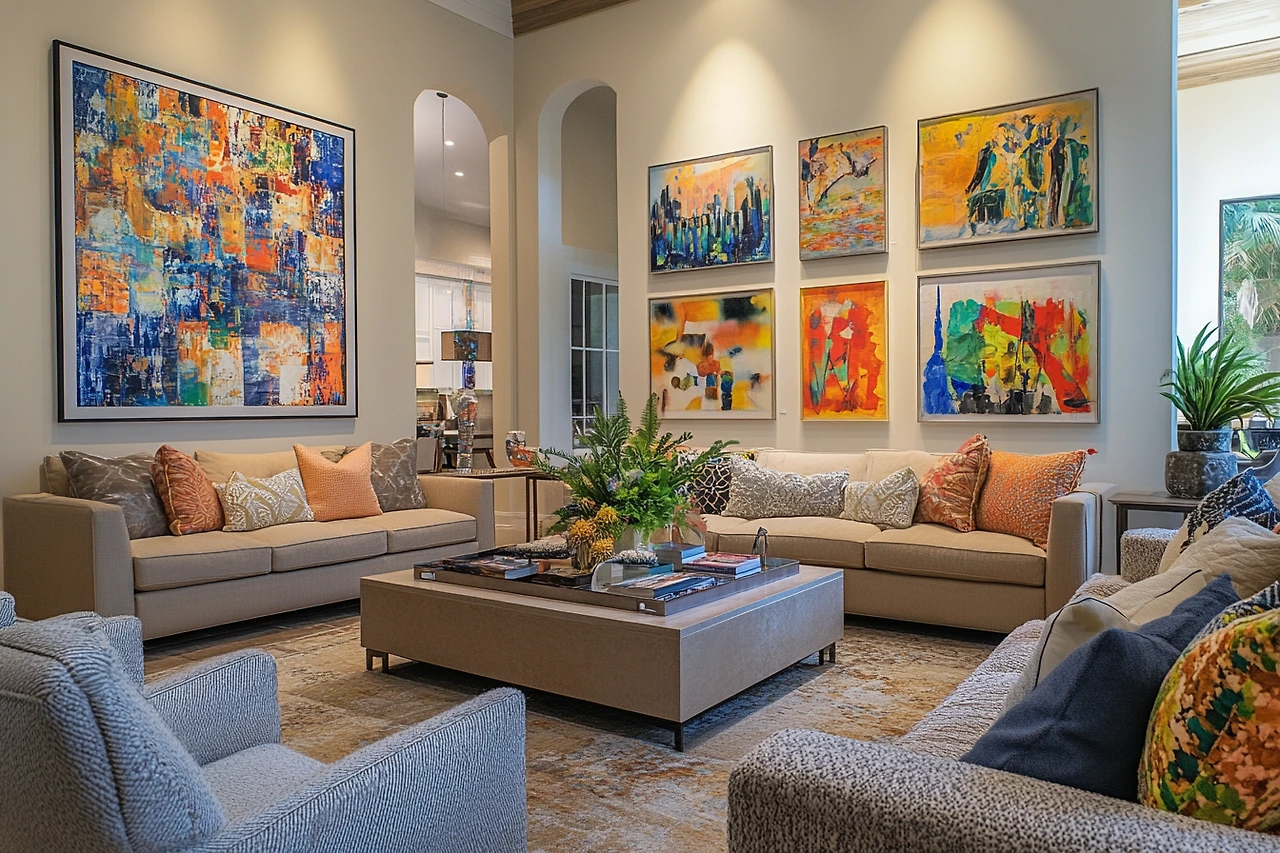 A living room with an art wall, featuring large paintings or a gallery of framed artworks. The wall serves as a focal point, showcasing artistic expression and enhancing the room's aesthetic.