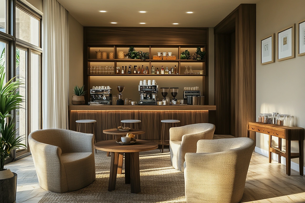 A living room with a café-style design, featuring small tables, comfortable chairs, and a coffee bar. The space is inviting and perfect for socializing or relaxing with a cup of coffee.
