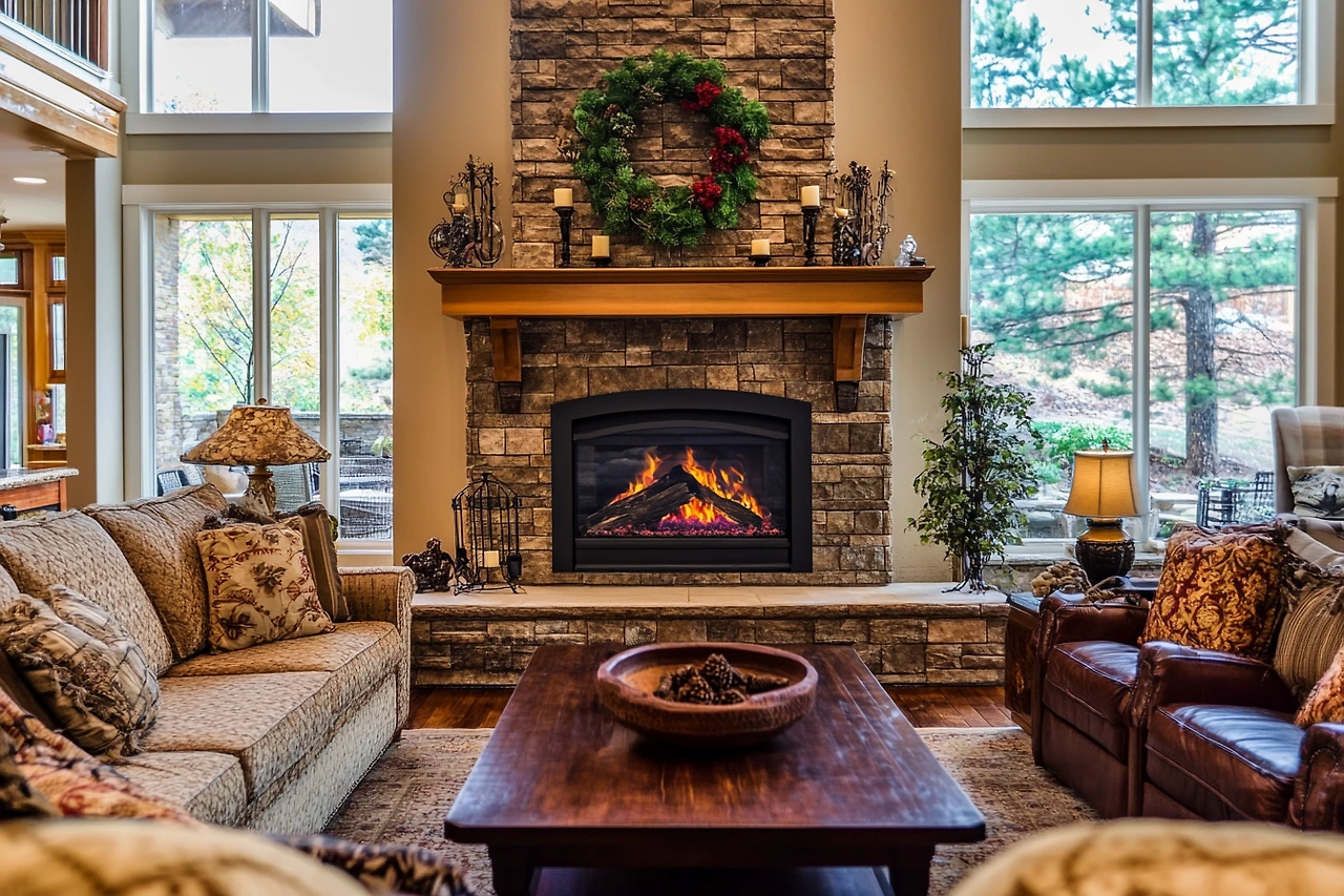 A living room centered around a stylish fireplace, creating a warm and cozy ambiance. The fireplace is a focal point, surrounded by comfortable seating and elegant decor.