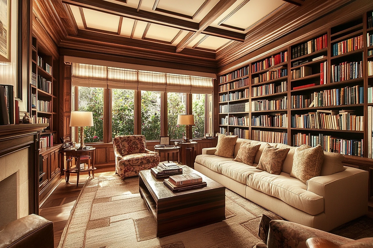 A living room designed like a library or study, with wall-to-wall bookshelves, comfortable seating, and a quiet, intellectual atmosphere. Perfect for reading and contemplation.