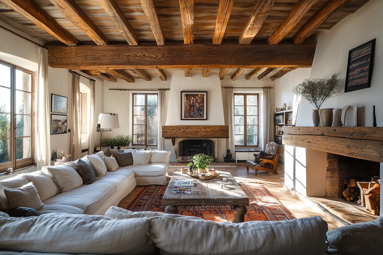 A living room in a country house, with rustic decor, exposed wooden beams, and a cozy, inviting atmosphere. The design is warm and homely, with natural materials and traditional elements.