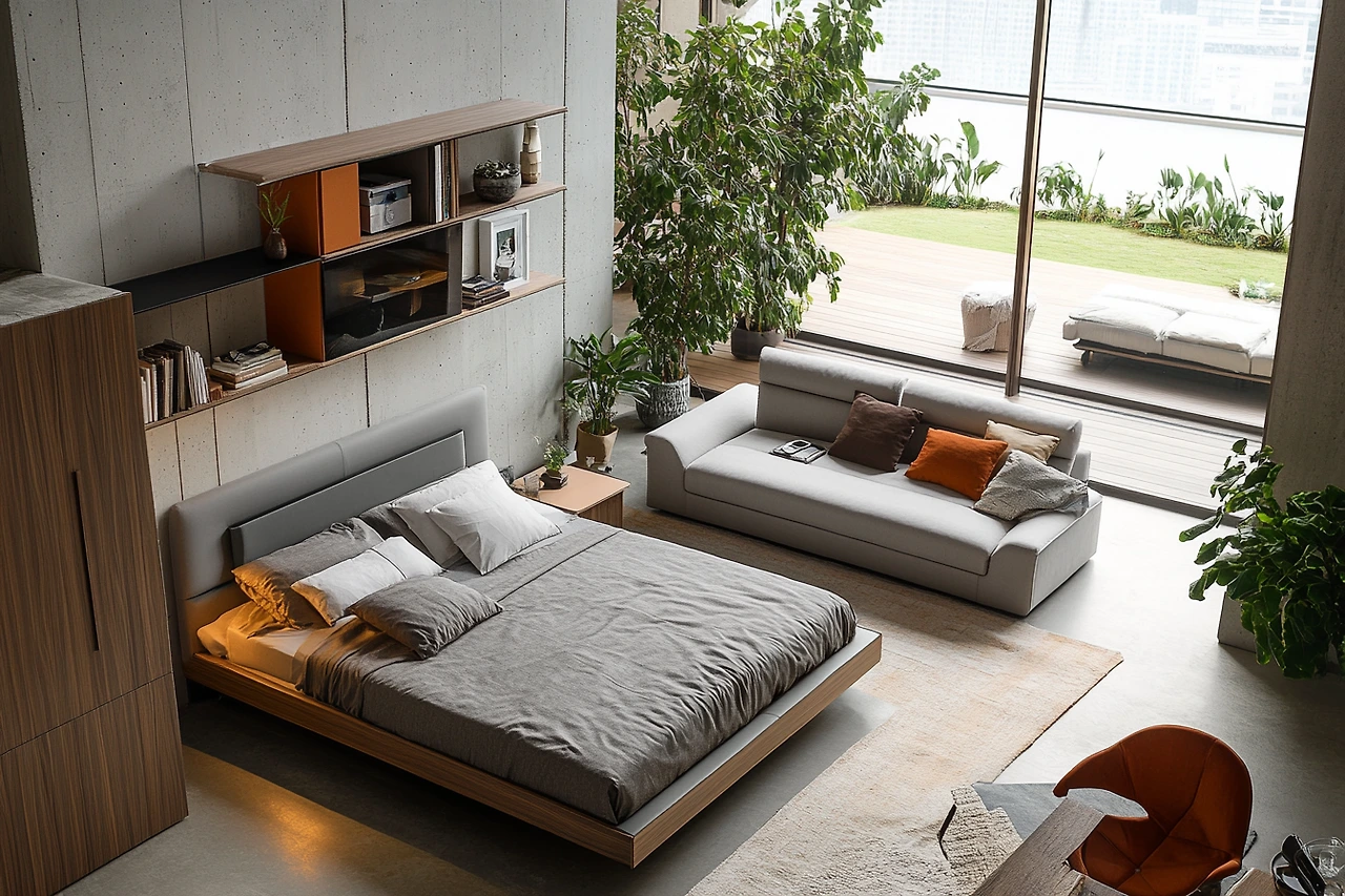 A living room that includes a stylish bed, blending the functions of a bedroom and living space. The bed is integrated seamlessly into the room's design, creating a cozy, multifunctional area.
