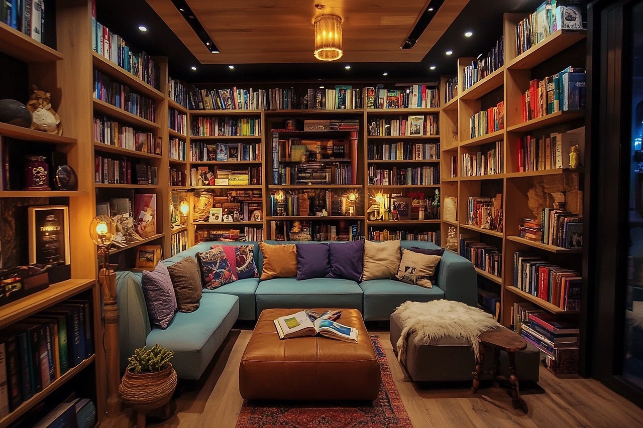 A living room designed like a book café, with cozy reading nooks, shelves filled with books, soft lighting, and comfortable seating. The atmosphere is inviting and perfect for book lovers.