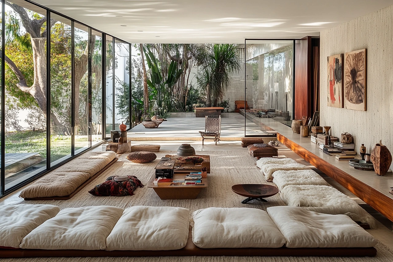 A living room designed without a sofa, focusing on alternative seating arrangements like floor cushions, lounge chairs, or a low seating area. The space is open, airy, and unique.