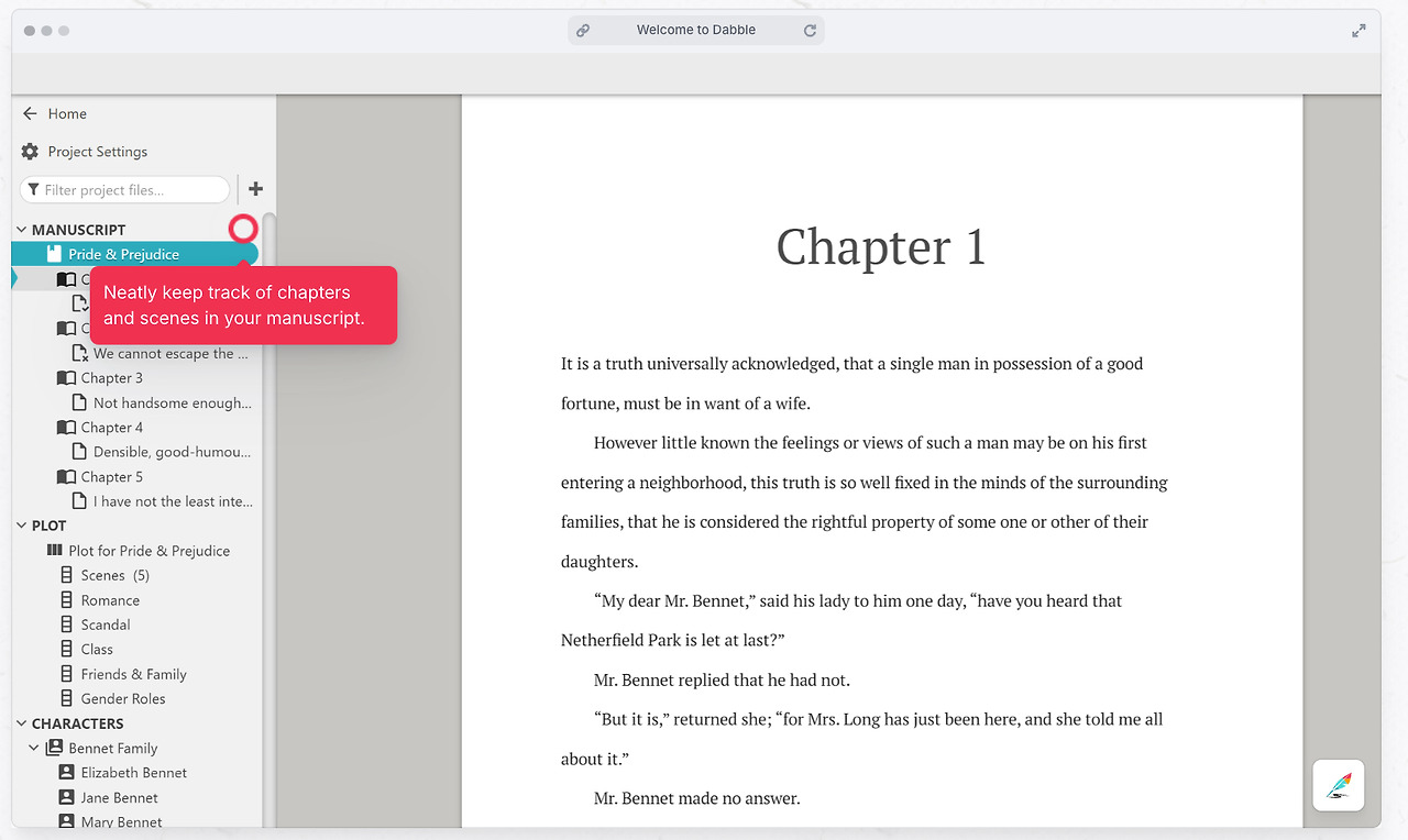 Dabble(대블)은 PC 설치형 프로그램과 웹사이트를 모두 제공하는 하이브리드형 소설 쓰기 소프트웨어입니다. 하나의 계정으로 컴퓨터 프로그램과 웹 브라우저 양쪽에서 글을 쓸 수 있고, 두 버전이 실시간 동기화되기 때문에 어느 환경에서 작업하든 내용이 즉시 업데이트됩니다. Dabble의 가장 큰 장점은 플롯 구성 기능인데요. 장면들을 카드 형태로 배열해 플롯을 한눈에 볼 수 있는 그리드형 플롯 보드를 지원하여, 이야기의 전개를 시각적으로 계획하기에 좋습니다. 또한 사이드바에 목표 단어 수와 진행률 등을 표시해주는 목표와 통계 기능이 있어 목표량을 채우는 재미도 느낄 수 있습니다.