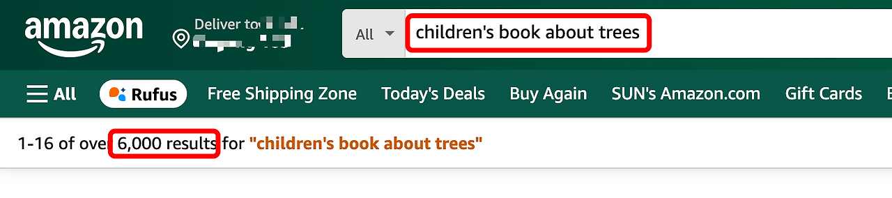 6,000개의 결과가 나옵니다. 검색 결과로 나오는 수치는 이 검색어를 타겟팅하는 경쟁책들이 그만큼 있다는 뜻입니다. 검색결과가 9천 이하인 검색어를 타겟팅하는 것이 성공 가능성을 높입니다. 아무래도 경쟁자가 적을 수록 내가 올린 책이 노출될 가능성이 많아지니까요.