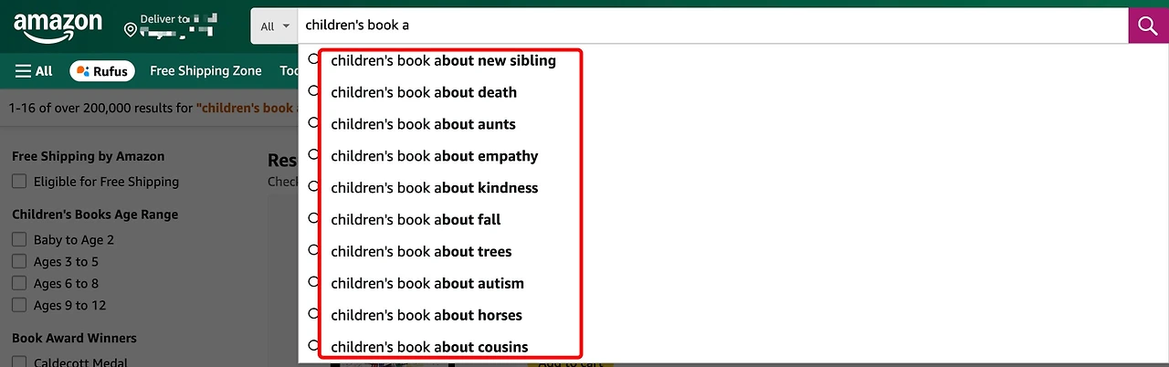 아마존 사이트로 가서 “Children’s book a”라고 쳐보십시오. 그러면 아래와 같이 a라는 글자가 들어간 검색어들이 뜹니다.