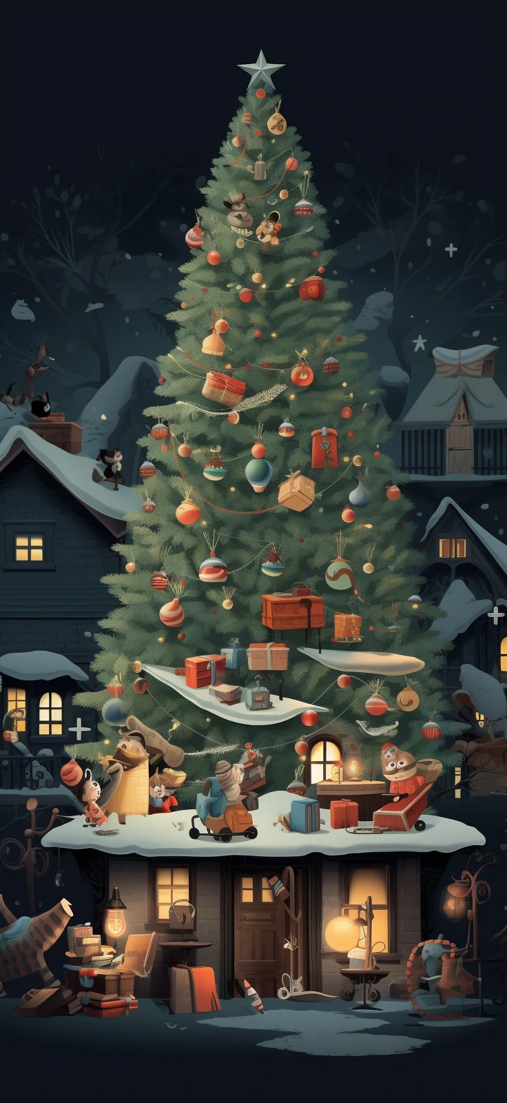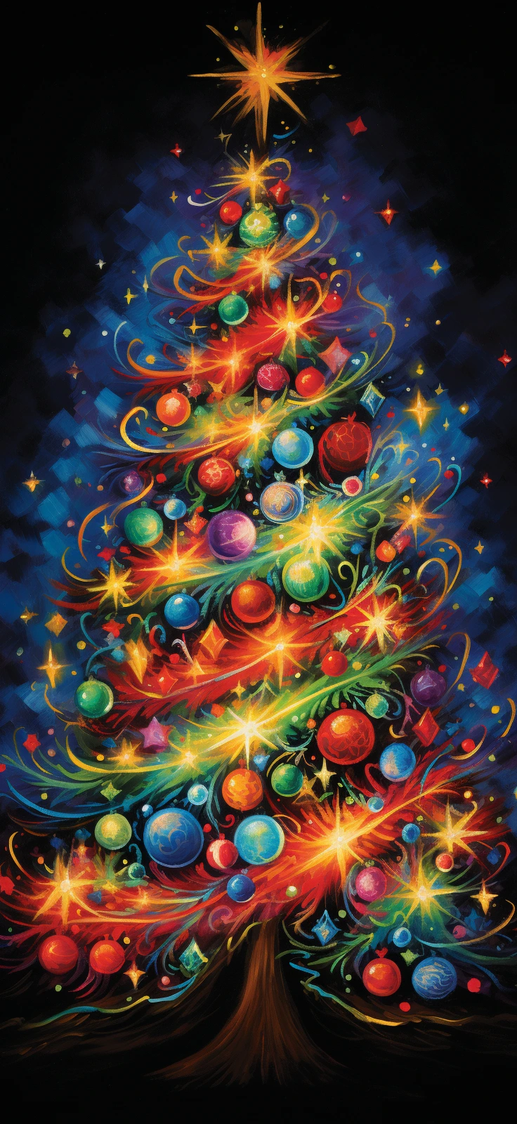 눈부시게 배열된 조명과 장식품이 있는 크리스마스트리를 특징으로 하는 생동감 있고 다채로운 디자인입니다.