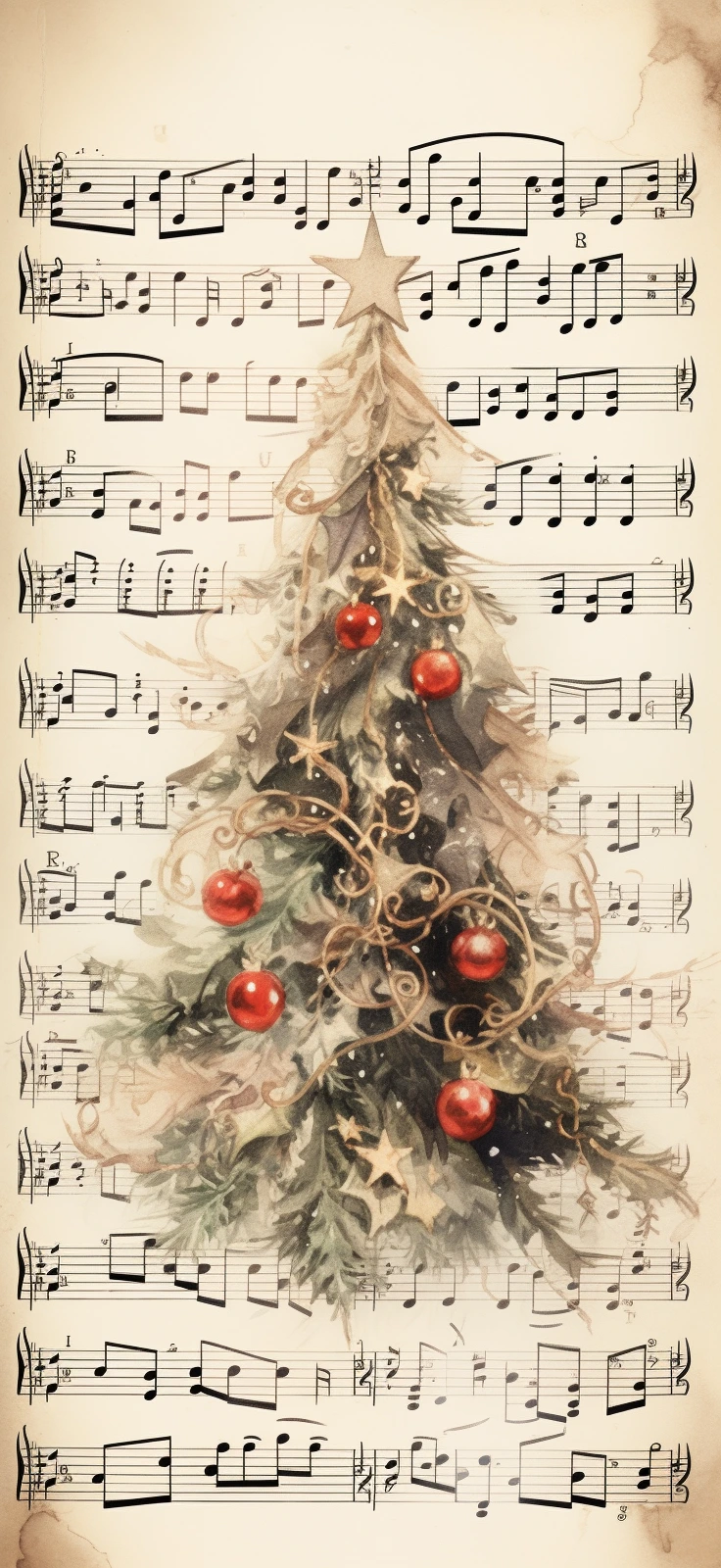음표와 가사가 담긴 빈티지 크리스마스 캐럴 악보를 예술적으로 표현한 일러스트입니다.