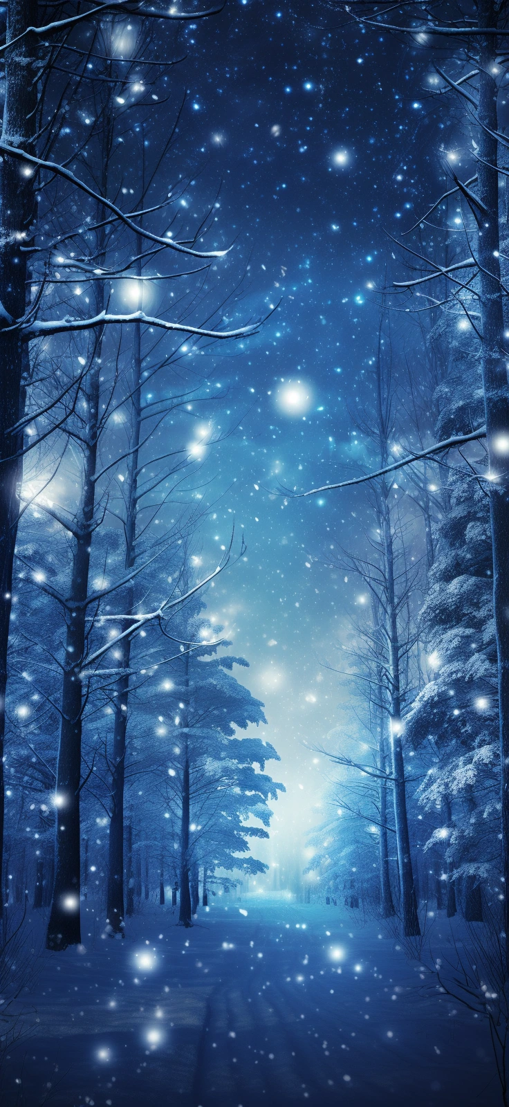 마법 같은 크리스마스 조명이 가미된 별빛 하늘 아래 겨울 숲을 그린 매혹적인 사진 스타일의 배경화면입니다.