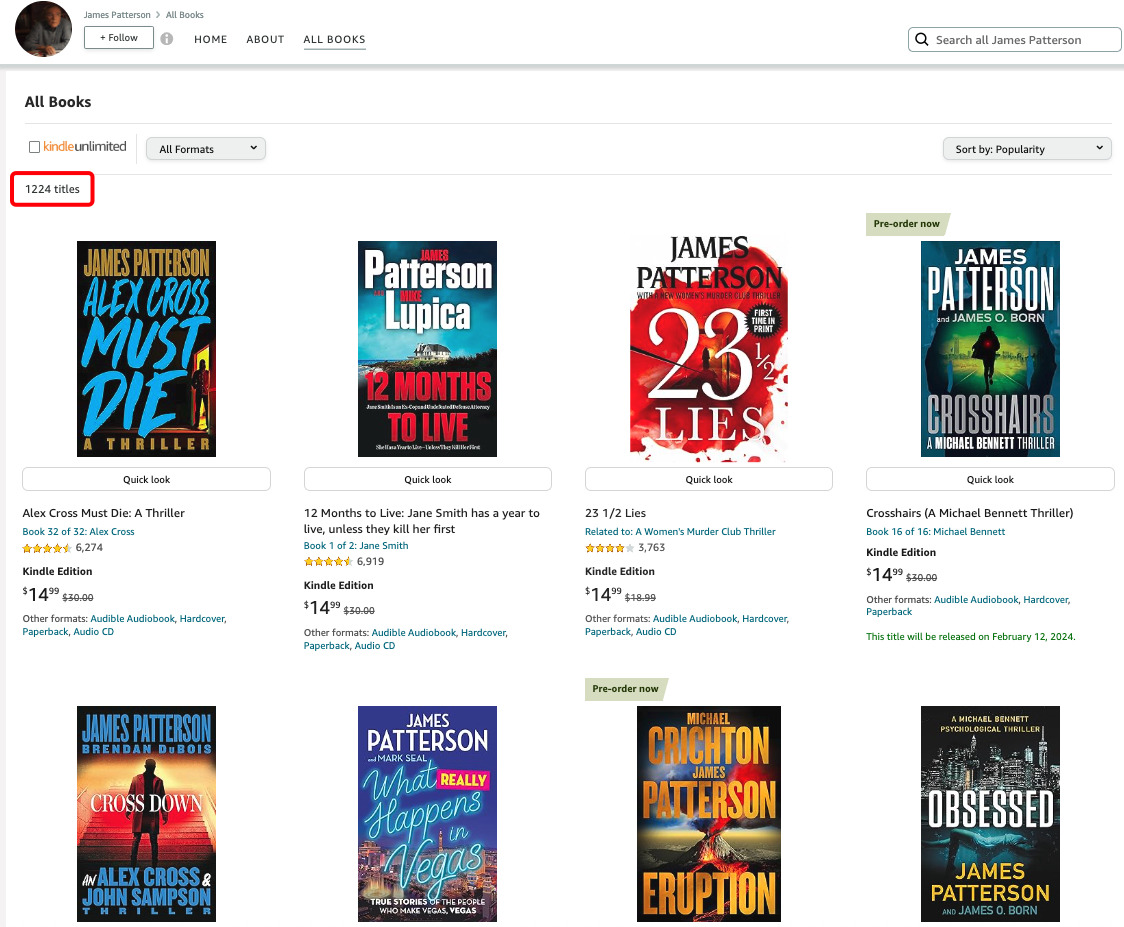 베스트셀러 작가 제임스 패터슨의 예를 생각해 보십시오. 아마존에 출판된 그의 책은 1,200권이 넘습니다. 그리고 이 책들의 대다수가 뉴욕 타임스 베스트셀러입니다.