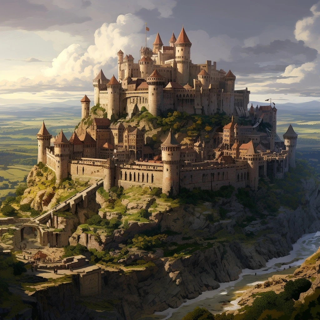 프롬프트: 인상적인 벽, 흉벽, 디자인의 전략적 복잡성을 강조하면서 프랑스 중세 요새의 상세한 이미지를 만듭니다.