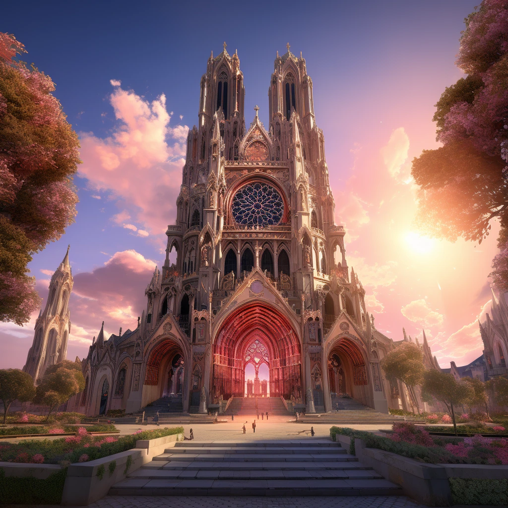 프롬프트: 복잡한 정면, 날아다니는 지지대, 스테인드 글라스 창문을 통해 빛의 유희를 강조하여 프랑스의 우뚝 솟은 고딕 성당의 이미지를 만듭니다.