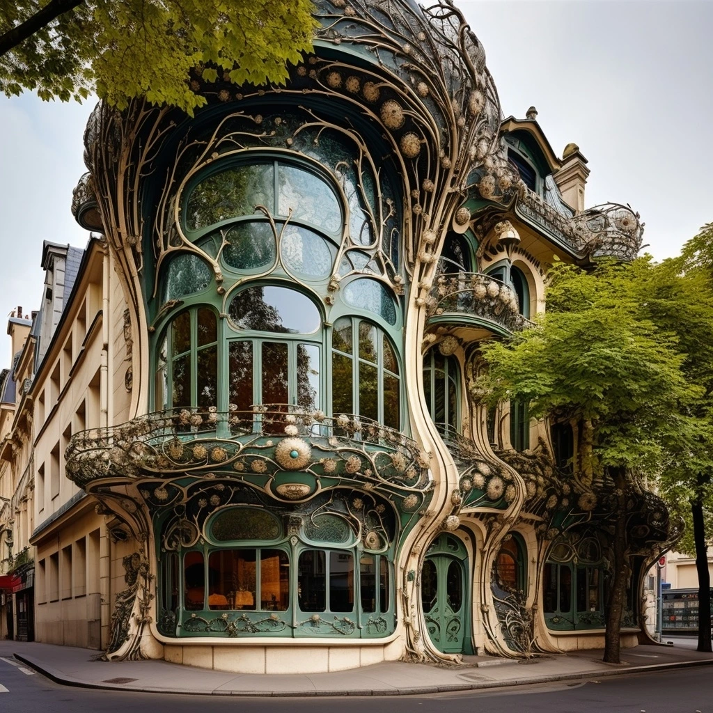 프롬프트: 유기적 형태, 복잡한 철공예, 건축과 장식 예술의 완벽한 조화에 중점을 두고 프랑스의 아르누보 건물을 시각화합니다.