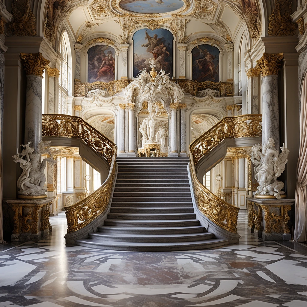 프롬프트: 극적인 곡선, 정교한 조각품, 넓은 홀의 고급스러움을 강조하면서 프랑스의 장엄한 바로크 양식의 궁전을 시각화합니다.