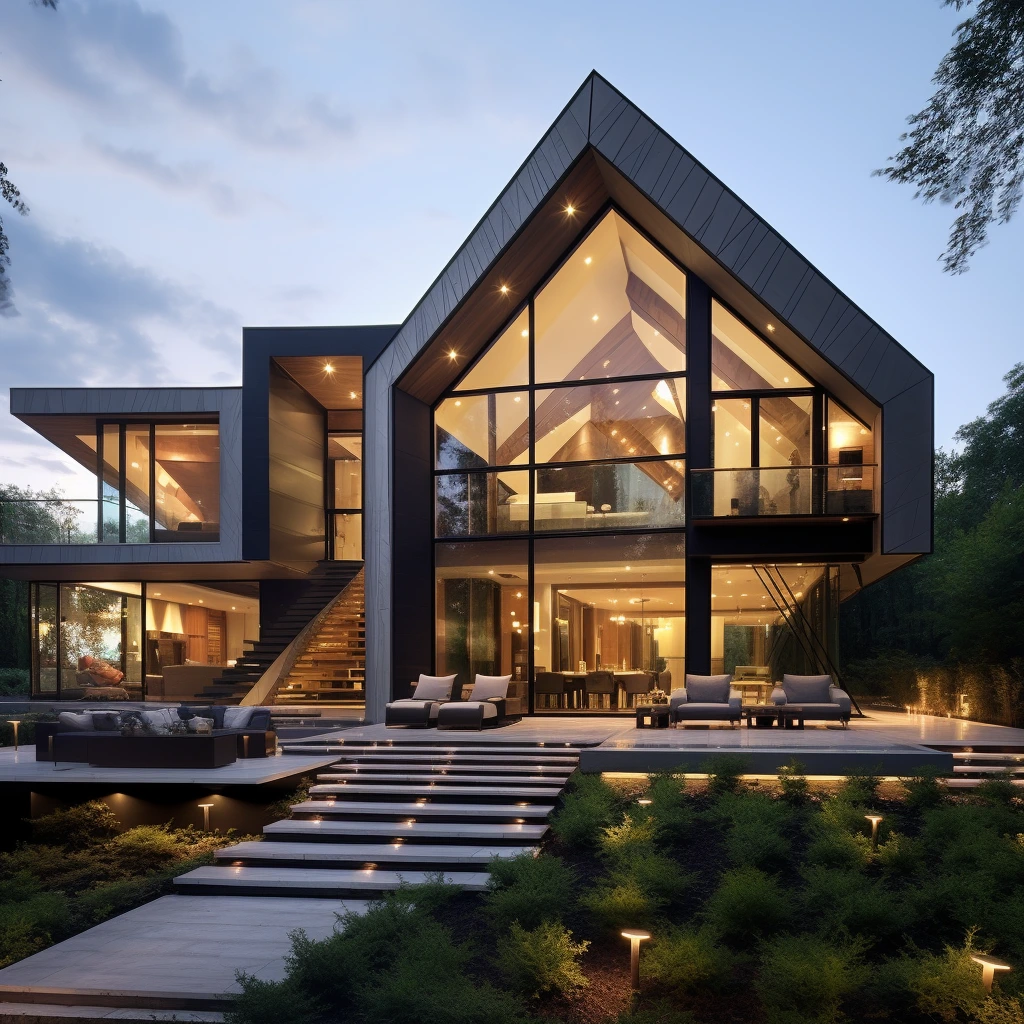 프롬프트: 혁신적인 재료 사용, 기하학적 형태 및 환경과의 통합을 강조하는 현대 프랑스 건축 걸작을 디자인합니다.