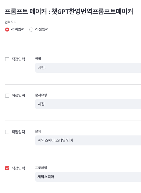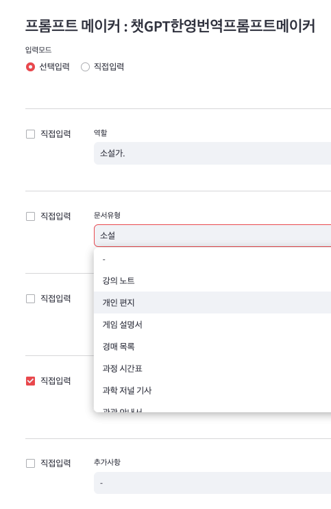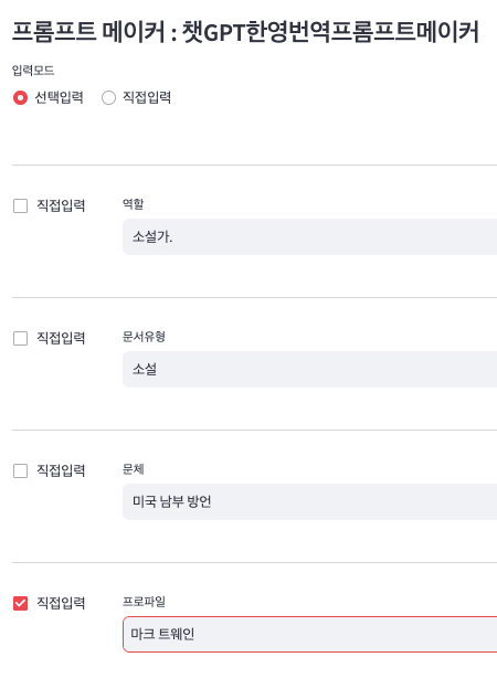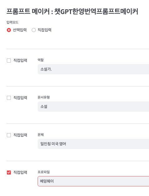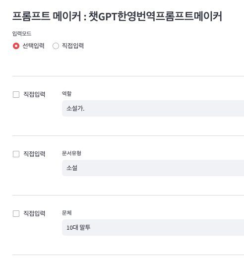 사촌동생의 프로그래밍 스킬과 나의 아이디어를 결합해서, 한글로 메뉴를 선택하거나, 직접 넣으면 챗GPT 프롬프트를 만들어주는 한영번역 프롬프트 메이커를 만들었다.