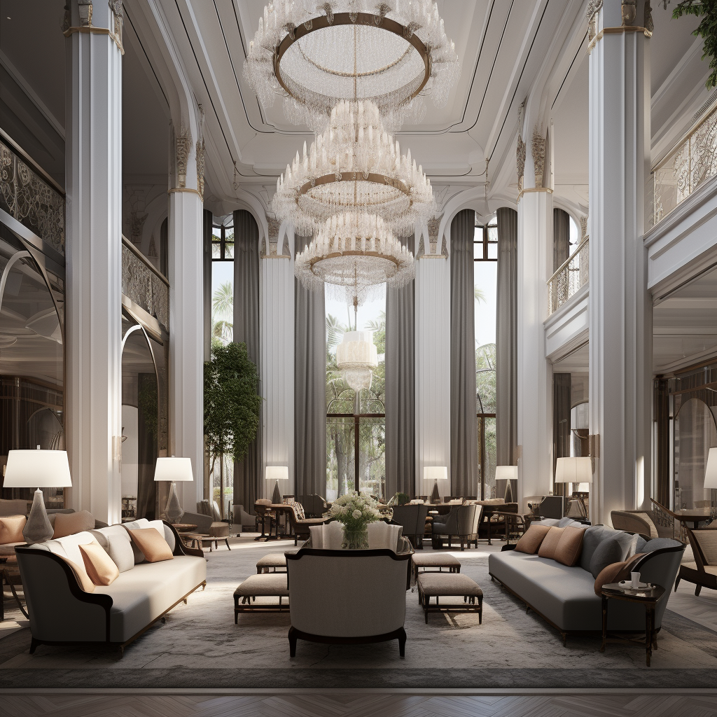 높은 천장, 웅장한 샹들리에, 자연 요소의 원활한 통합을 특징으로 하는 클래식한 우아함과 현대적인 고급스러움이 조화를 이루는 넓은 호텔 로비입니다.