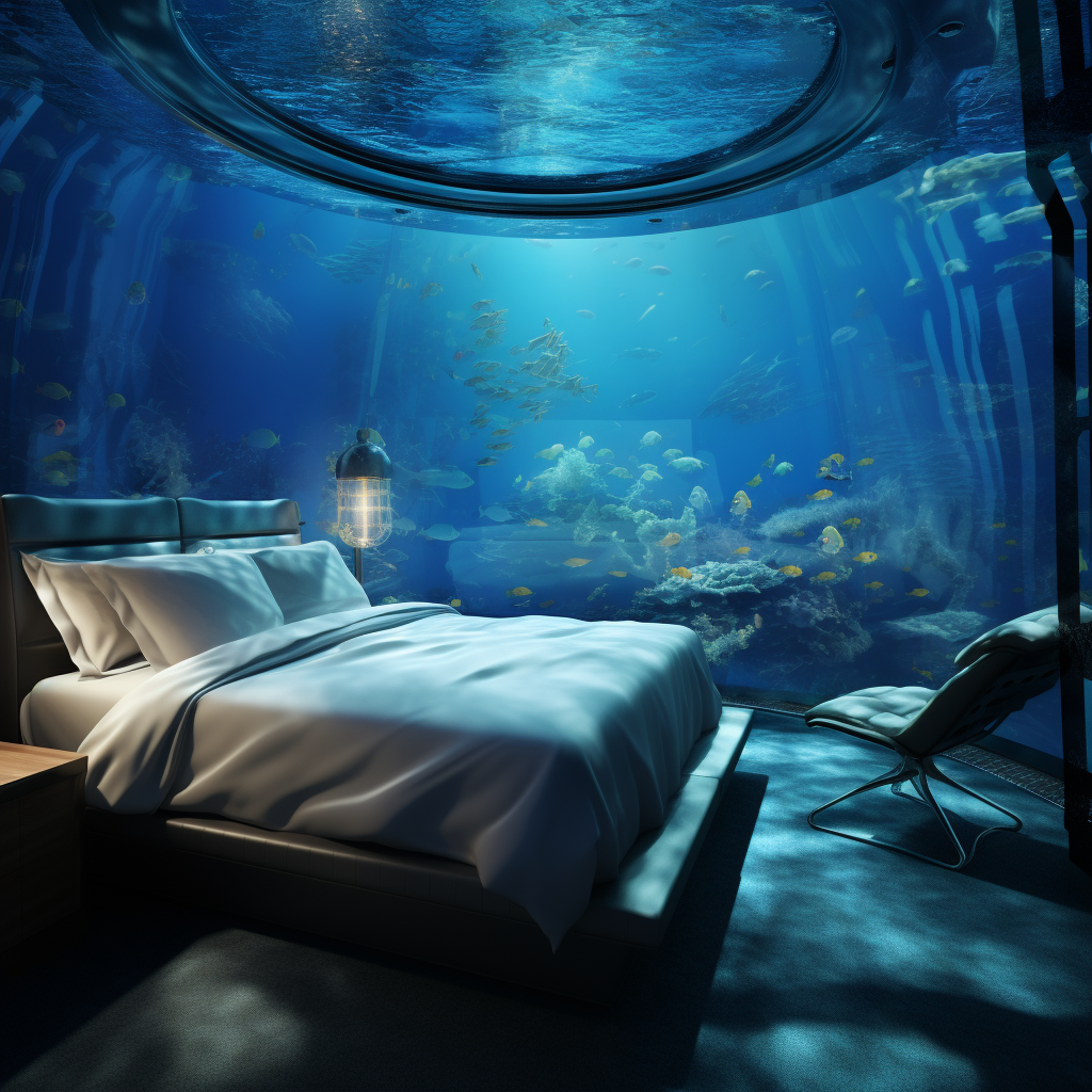 바다 생물의 매혹적인 전망을 제공하는 수중 호텔 객실로, 투명한 벽과 주변 조명이 고객을 해양 환경에 몰입하도록 설계되었습니다.