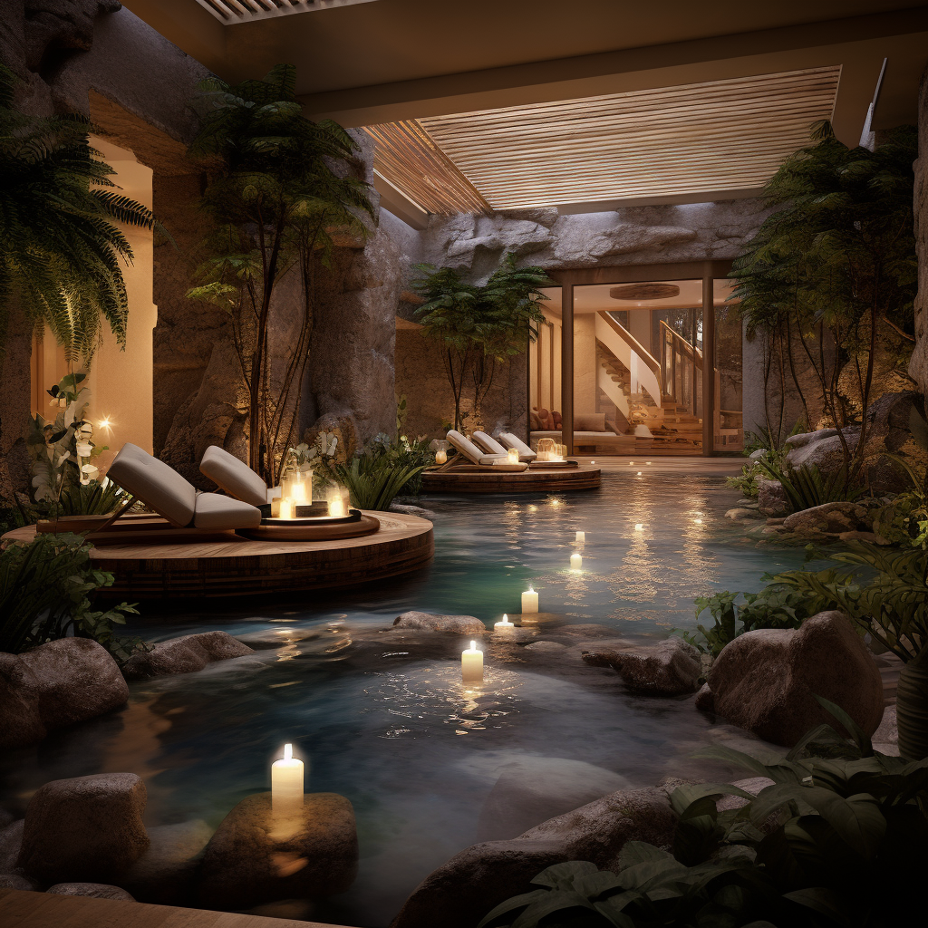 웰니스의 성지로 설계된 고급스러운 호텔 스파로, 자연석, 진정제 기능을 갖춘 수면 및 고요한 명상 공간을 갖추고 있습니다.