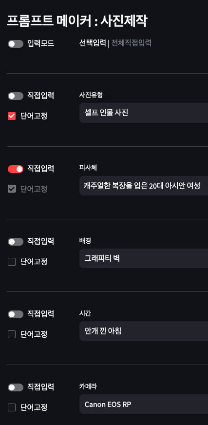 한글 메뉴만 선택하면 정교한 영문 프롬프트를 만들어주는 AI 사진 제작을 위한 미드저니 프롬프트 메이커는 이러한 문제를 해결해줍니다. 또한 메이커에 포함된 프롬프트 자동생성 기능을 활용하면 전혀 예상치 못한 새로운 스타일의 AI 인물사진을 위한 프롬프트를 만들 수 있습니다. 창의적인 인물사진을 찾는 사진가나 디자이너에게 새로운 돌파구를 열어줄 수 있습니다.