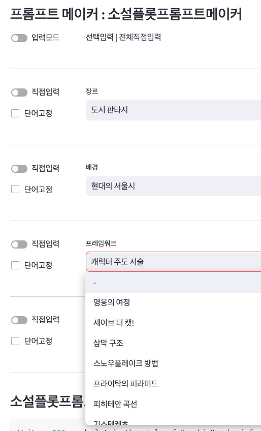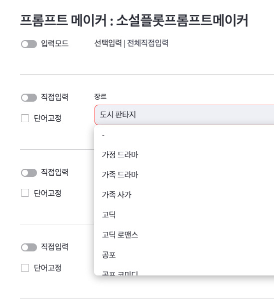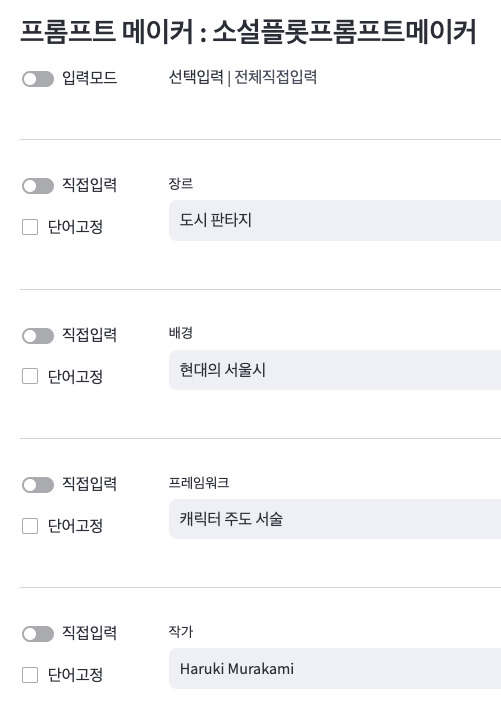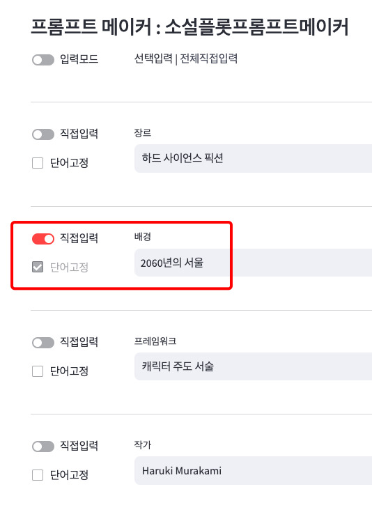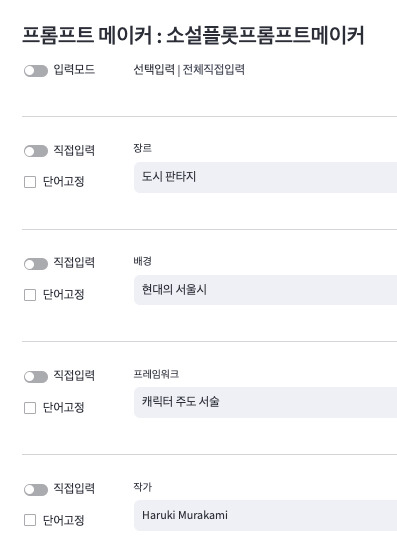 직접 입력을 선택하고, 원하는 내용을 넣으면 플롯의 가능성을 더욱 넓힐 수 있습니다. 한글로 넣은 메뉴는 자동으로 영어 프롬프트로 번역됩니다.