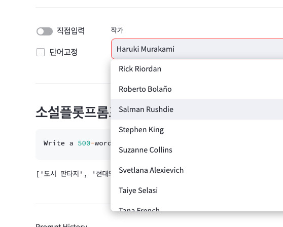 순수문학 및 대중문학을 망라하는 다양한 작가 99명을 넣었습니다. 특정 작가 스타일의 플롯을 생성하는 챗GPT 프롬프트를 만들 수 있습니다.