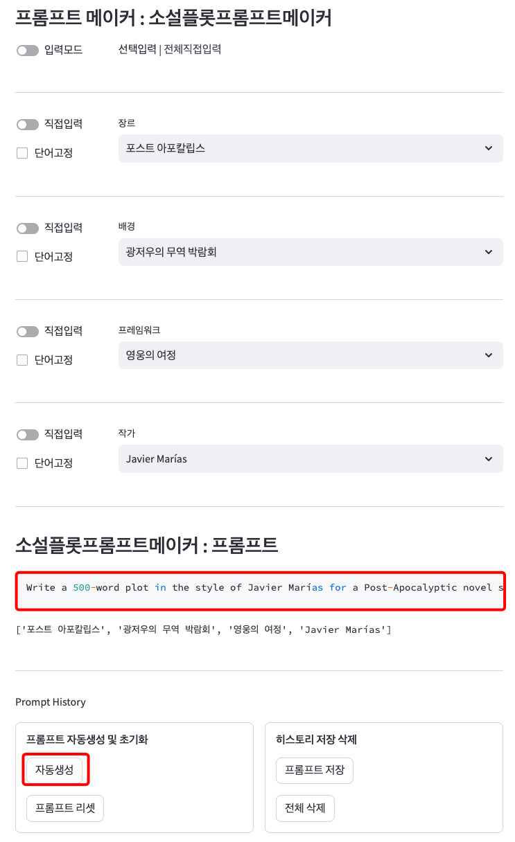 플롯 프롬프트 메이커의 자동생성 기능을 사용하면 작가가 상상하지도 못한 특이한 플롯을 만들 수 있습니다.