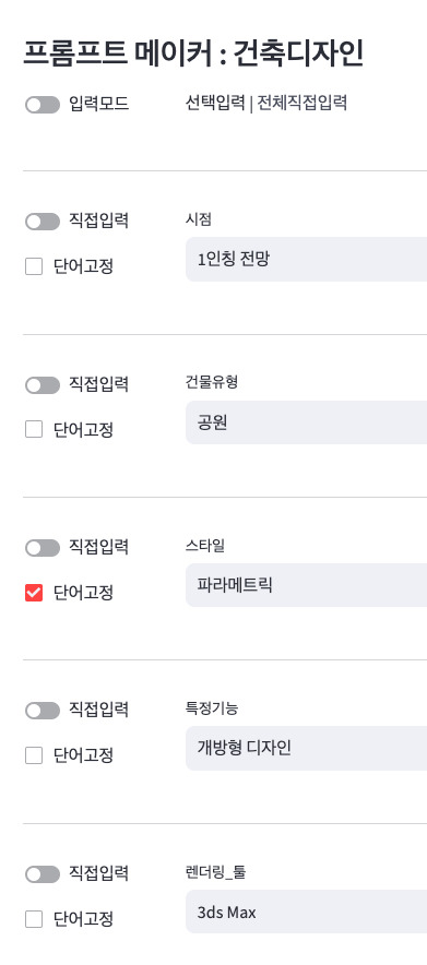 미드저니와 프롬프트 메이커를 사용해서 만든 파라 메트릭 디자인 건축물을 소개합니다. 아래와 같이 프롬프트 메이커에서 파라메트릭을 건축 스타일로 고정하고, 랜덤으로 생성한 프롬프트로 디자인을 만들었습니다.