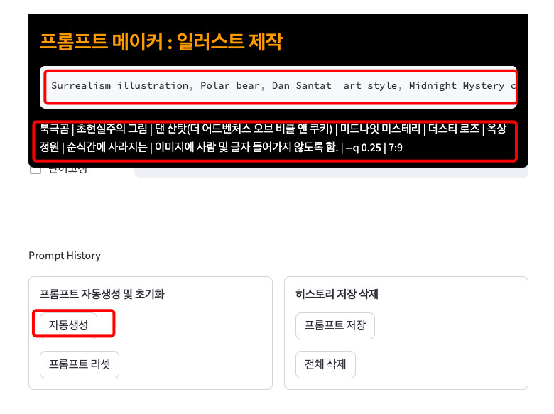 프롬프트 자동생성 버튼을 눌러주면 일러스트 디자인을 위한 다양한 요소가 무작위로 결합된 영문 프롬프트가 자동으로 만들어집니다. 복사해서 미드저니에 넣어주면 끝입니다.