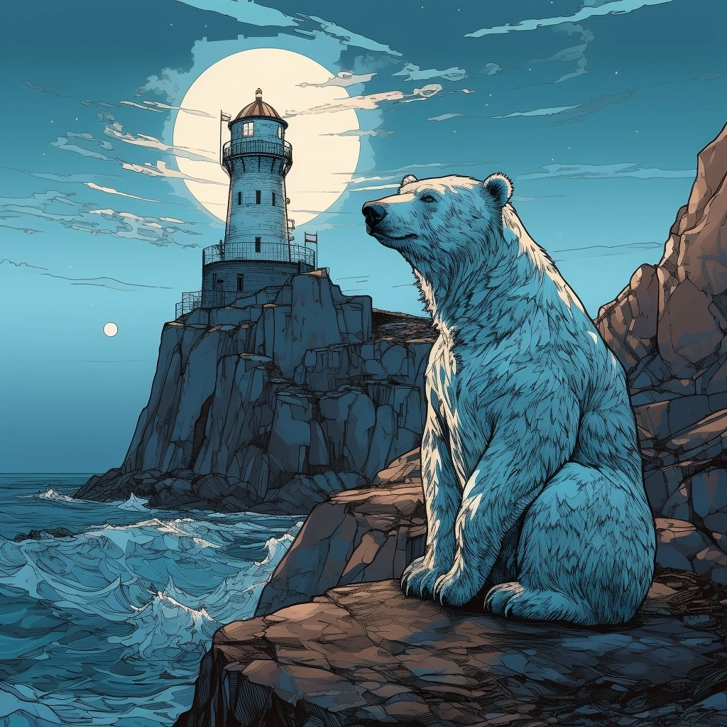 북극곰 일러스트: Scientific Illustration, Polar bear, Frank Quitely art style, Digital Blue color palette, Chocolate Brown background, Old lighthouse on a cliff background, Dystopian mood, --q 1 --ar 1:1