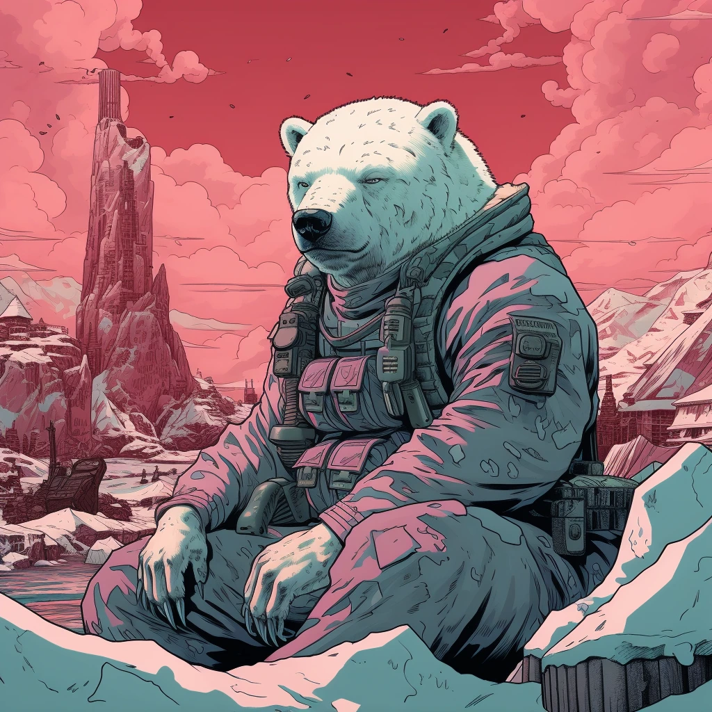 북극곰 일러스트: Engraving Illustration, Polar bear, Daniel Clowes art style, Cyberpunk Contrast color palette, Dusty Rose background, Ancient battlefield background, Wicked mood, --q 1 --ar 1:1