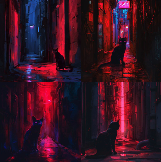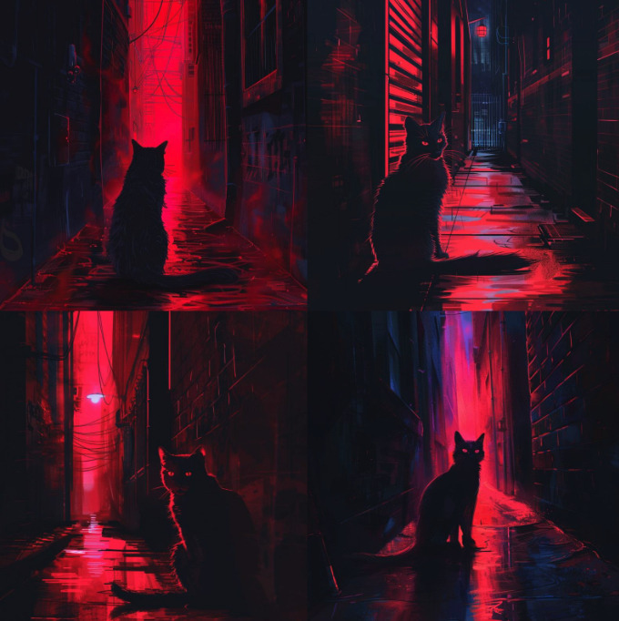 "cat, surreal illustration, dark alley, neon light, vibrant red"