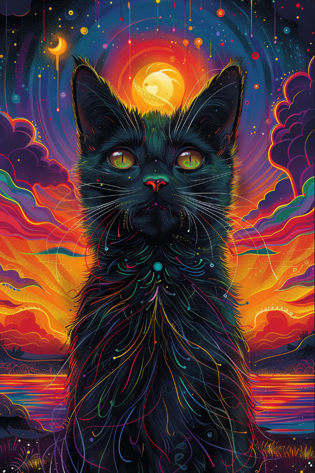 "Psychedelic cartoon cat inspired by Lisa Frank, characterized by thick, bold lines and neon green colors. The cat is depicted in front of a stunning sunset, with bright and vivid shades of orange, pink, and purple filling the sky. The style is cheerful and colorful, with playful, exaggerated details. The composition uses a close-up shot to highlight the cat's neon hues and intricate patterns, set against the vibrant sunset. The lighting is intense and radiant, enhancing the psychedelic and fantastical atmosphere of the scene"