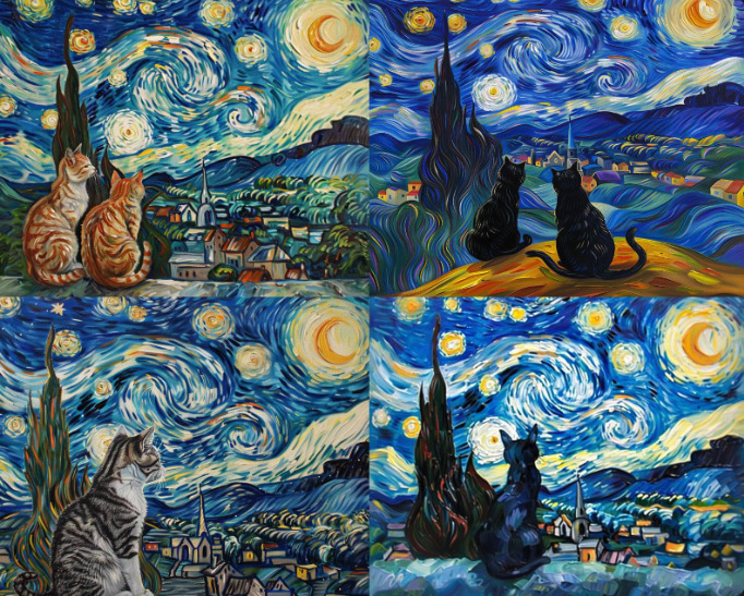 위의 프롬프트의 특정 부분을 다른 단어로 바꿔서 새로운 일러스트를 만들 수도 있습니다. 첫번째 프롬프트의 "Starry Night is"를 "two cats"로 대체하면 다음과 같은 반 고흐 풍의 고양이 일러스트를 만들 수 있습니다.