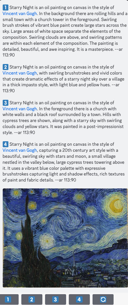 미드저니에 describe 명령어를 넣고 반 고흐의 "별이 빛나는 밤" 이미지를 올립니다. 그러면 이미지에 기초해서 4개의 프롬프트를 만들어줍니다.